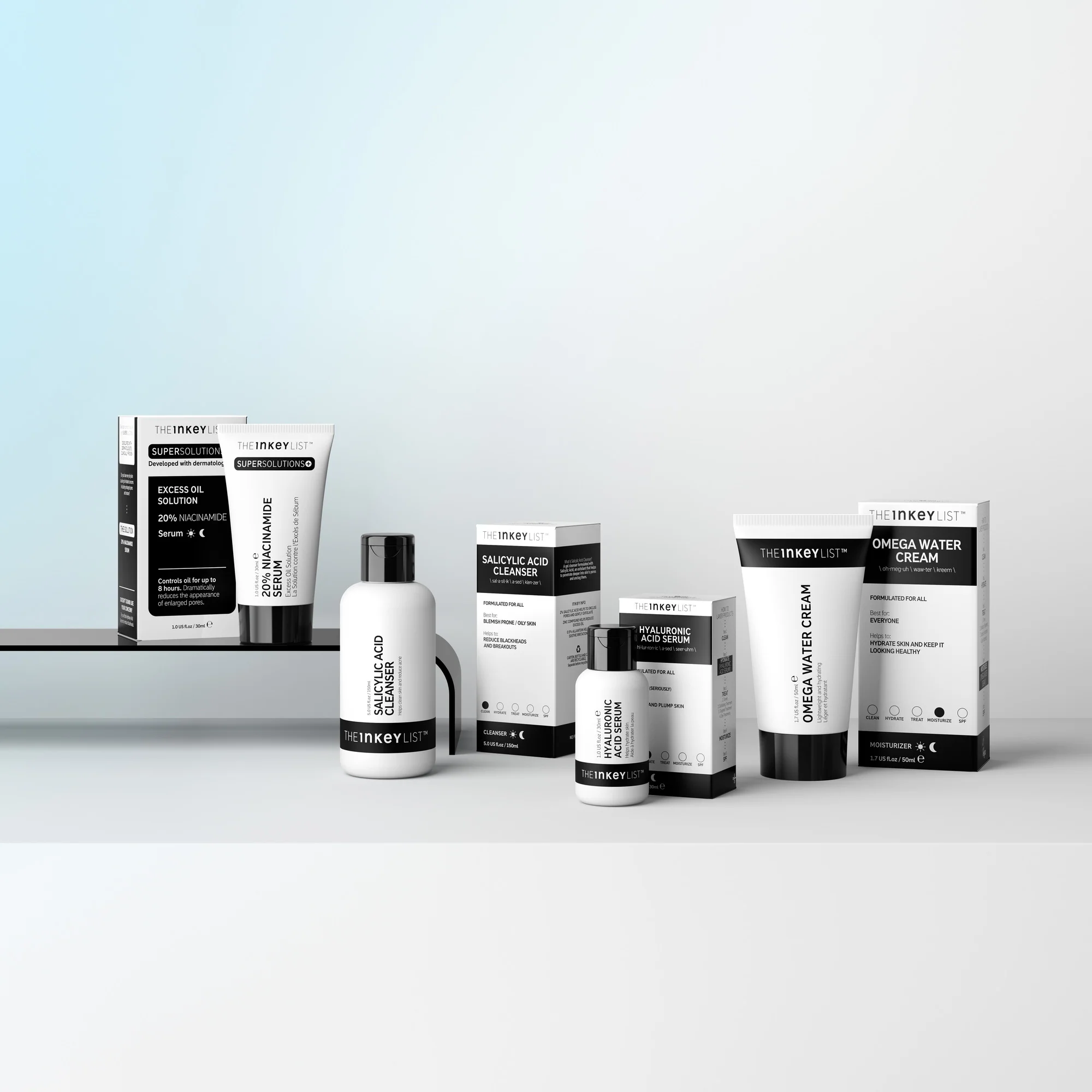 The key ingredient in this excess oil is our powerful pore-minimiser Niacinamide. Excess Oil Solution with 20% Niacinamide helps reduce excess oil production throughout the day and effectively tighten the look of enlarged pores. Supporting ingredients in this excess oil and pore-minimising routine are; Salicylic Acid Cleanser (helps with oil-control), Hyaluronic Acid Serum (keeps skin healthy and hydrated) and Omega Water Cream (a lightweight, oil-free moisturiser that contains Niacinamide in its formula).